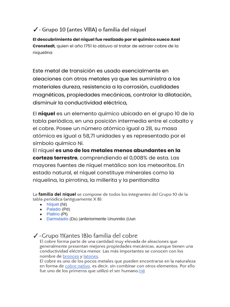 ✓- Grupo 10 (antes VlllA) o familia del níquel