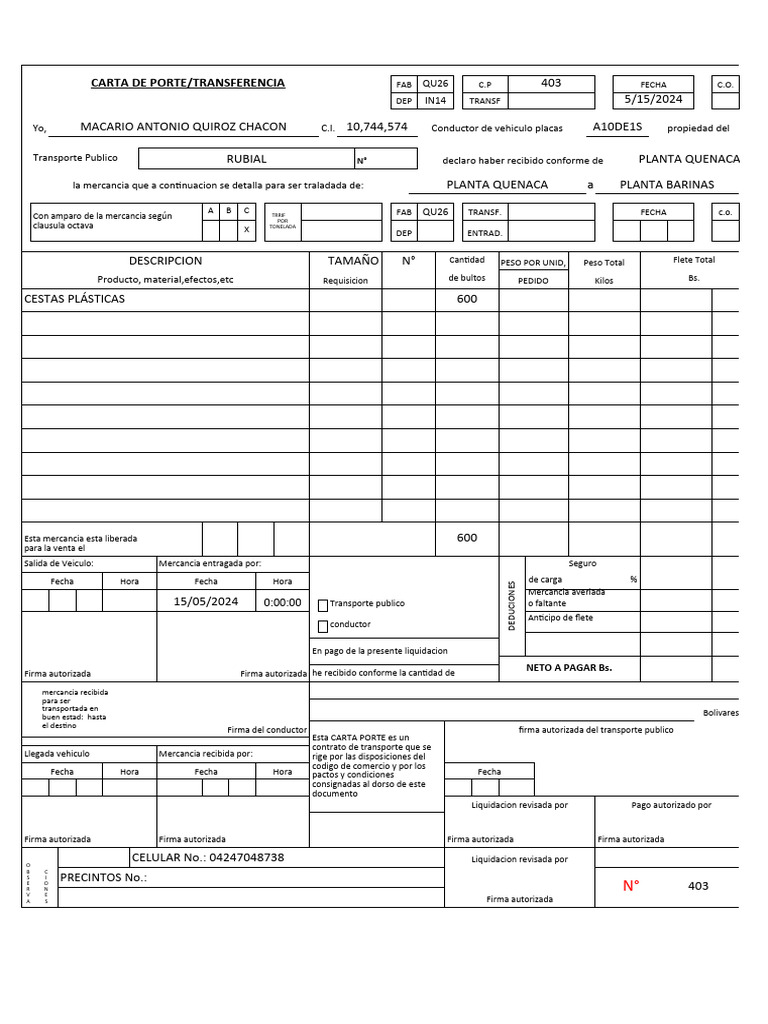 CARTA DE PORTE/TRANSFERENCIA FAB QU26 C.P 403 FECHA C.O.