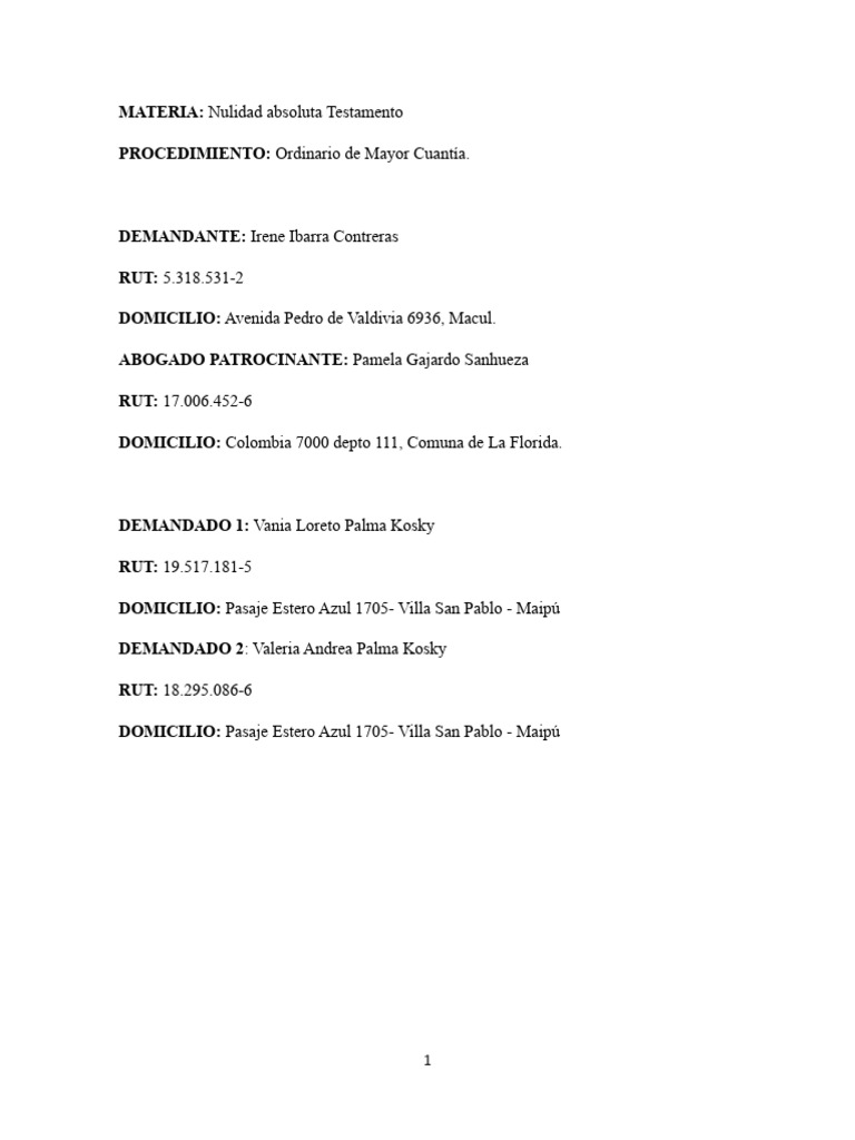 absoluta de Testamento en contra de Doña Vania Loreto Palma Kosky, se desconoce