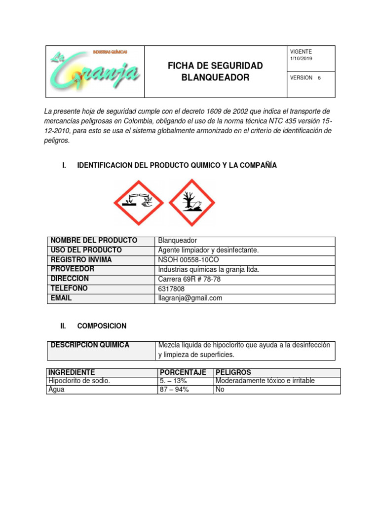 DESCRIPCION QUIMICA Mezcla liquida de hipoclorito que ayuda a la desinfección