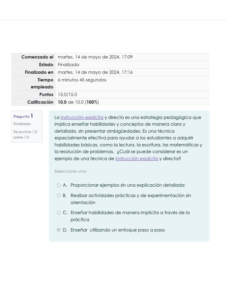 Pregunta 1 La instrucción explícita y directa es una estrategia pedagógica que