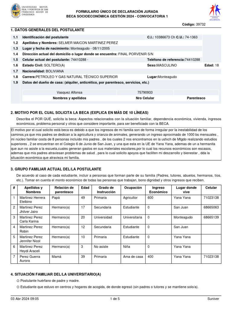 BECA SOCIOECONÓMICA GESTIÓN 2024 - CONVOCATORIA 1