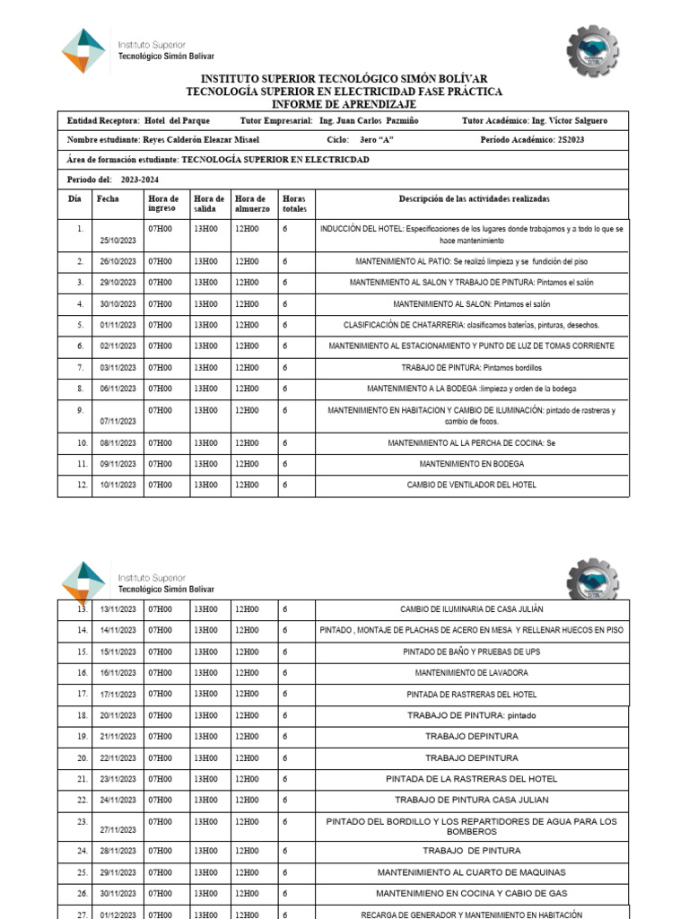 41. 21/12/2023 07H00 15H30 12H00 8 ARREGLO DE CUADROS EN BAÑOS Y LLENAR TANQUES DEL GENERADOR