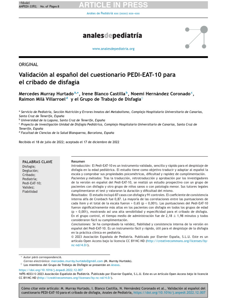 cuestionario PEDI-EAT-10 para el cribado de disfagia, Anales de Pediatría, https://doi.org/10.1016/j.anpedi.2022.12.007
