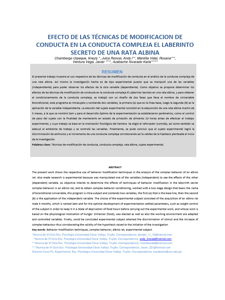 efectos de las técnicas de modificación de conducta en la conducta compleja El Laberinto Secreto en una rata albina, y para obtener