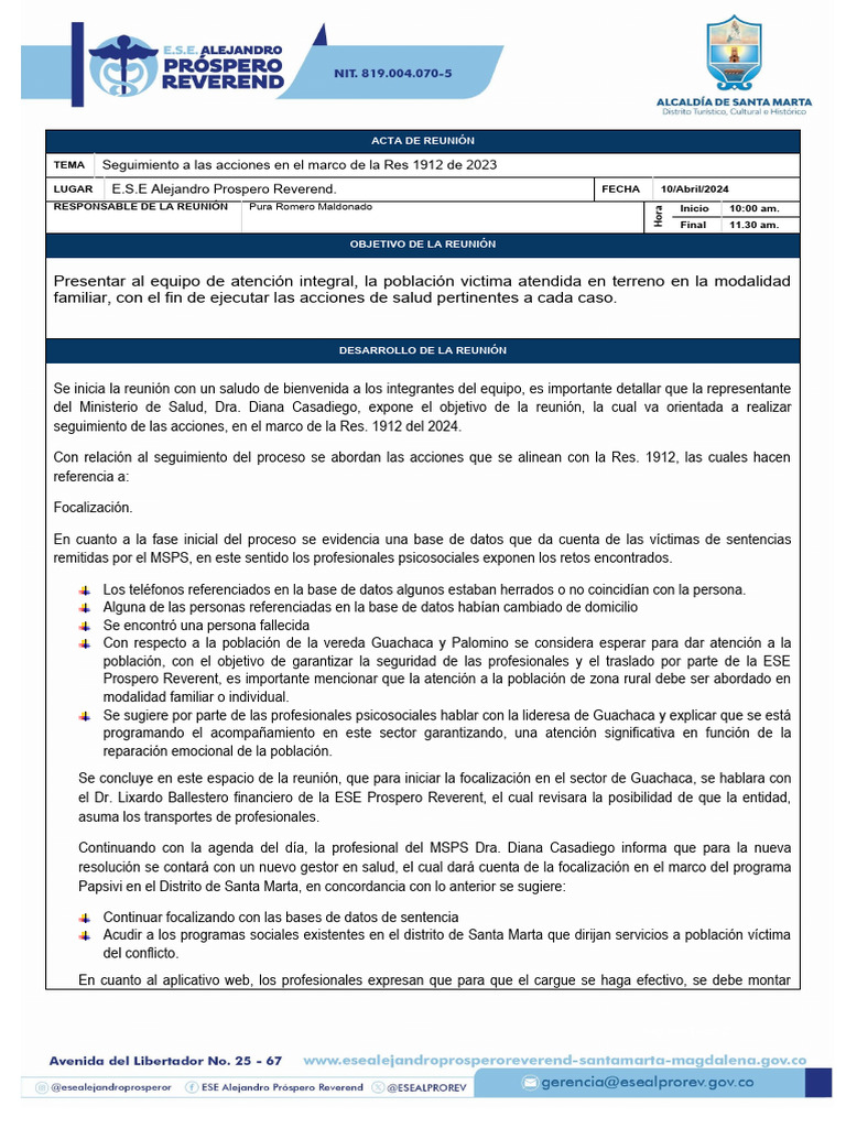 seguimiento de las acciones, en el marco de la Res. 1912 del 2024.