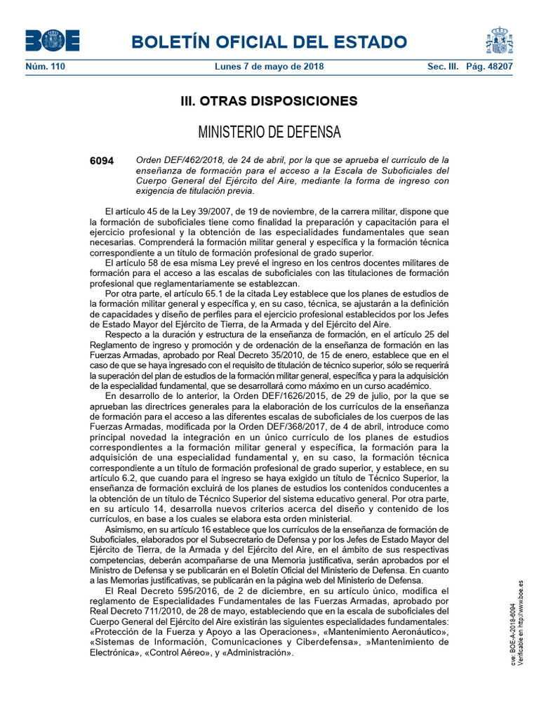 6094 Orden DEF/462/2018, de 24 de abril, por la que se aprueba el currículo de la