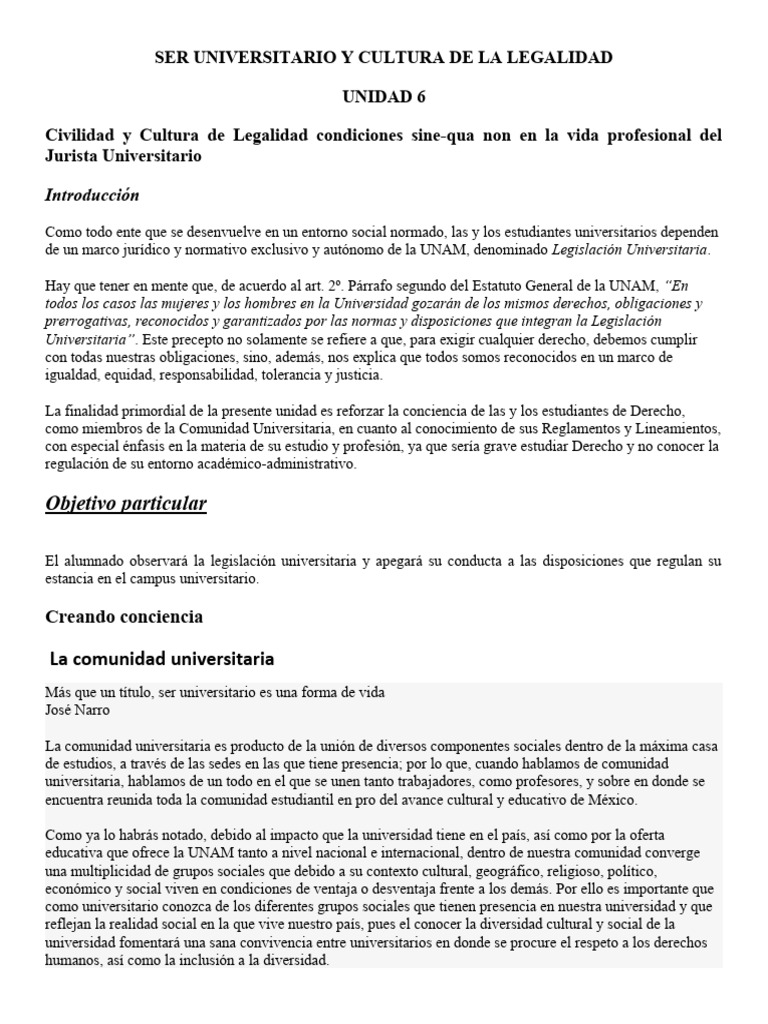 La finalidad primordial de la presente unidad es reforzar la conciencia de las y los estudiantes de Derecho,