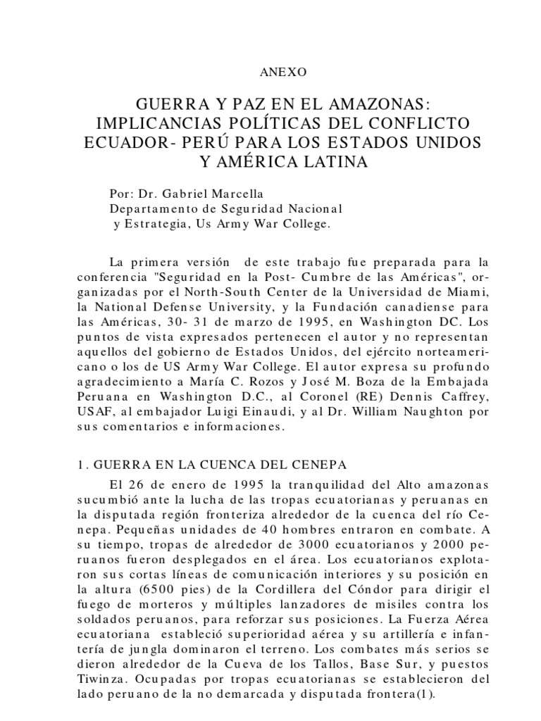 Por: Dr. Gabriel Marcella Departamento de Seguridad Nacional y Estrategia, Us Army War College. La primera versin de este trabajo fue preparada para la conferencia "Seguridad en la Post- Cumbre de las Amricas", organizadas por el North-South Center de la Universidad de Miami, la National Defense University, y la Fundacin canadiense para las Amricas, 30- 31 de marzo de 1995, en Washington DC. Los puntos de vista expresados pertenecen el autor y no representan aquellos del gobierno de Estados Unidos, del ejrcito norteamericano o los de US Army War College. El autor expresa su profundo agradecimiento a Mara C. Rozos y Jos M. Boza de la Embajada Peruana en Washington D.C., al Coronel (RE) Dennis Caffrey, USAF, al embajador Luigi Einaudi, y al Dr. William Naughton por sus comentarios e informaciones. 1. GUERRA EN LA CUENCA DEL CENEPA El 26 de enero de 1995 la tranquilidad del Alto amazonas sucumbi ante la lucha de las tropas ecuatorianas y peruanas en la disputada regin fronteriza alrededor de la cuenca del ro Cenepa. Pequeas unidades de 40 hombres entraron en combate. A su tiempo, tropas de alrededor de 3000 ecuatorianos y 2000 peruanos fueron desplegados en el rea. Los ecuatorianos explotaron sus cortas lneas de comunicacin interiores y su posicin en la altura (6500 pies) de la Cordillera del Cndor para dirigir el fuego de morteros y mltiples lanzadores de misiles contra los soldados peruanos, para reforzar sus posiciones. La Fuerza Area ecuatoriana estableci superioridad area y su artillera e infantera de jungla dominaron el terreno. Los combates ms serios se dieron alrededor de la Cueva de los Tallos, Base Sur, y puestos Tiwinza. Ocupadas por tropas ecuatorianas se establecieron del lado peruano de la no demarcada y disputada frontera(1).