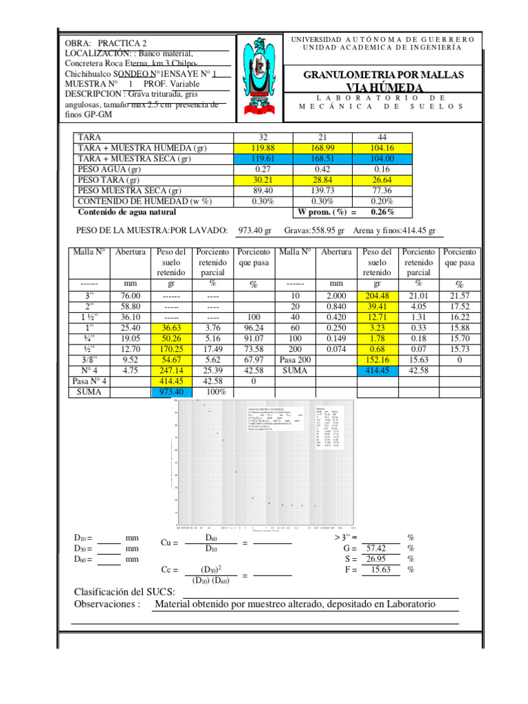 PESO DE LA MUESTRA:POR LAVADO: 973.40 gr Gravas:558.95 gr Arena y finos:414.45 gr