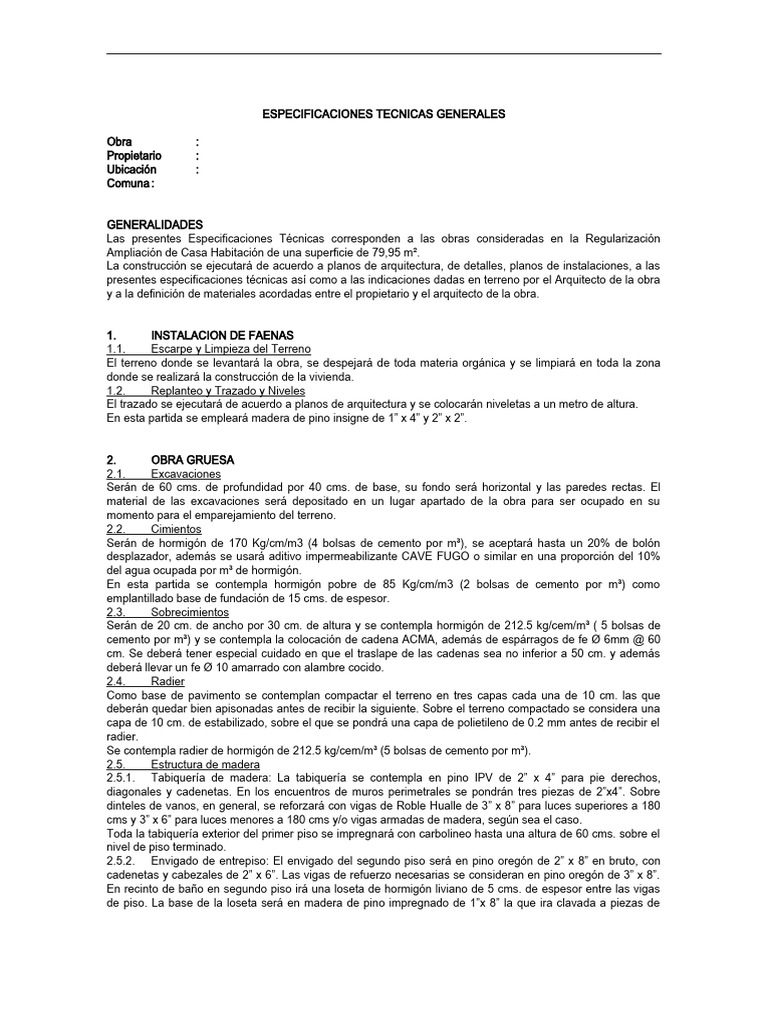 presentes especificaciones técnicas así como a las indicaciones dadas en terreno por el Arquitecto de la obra