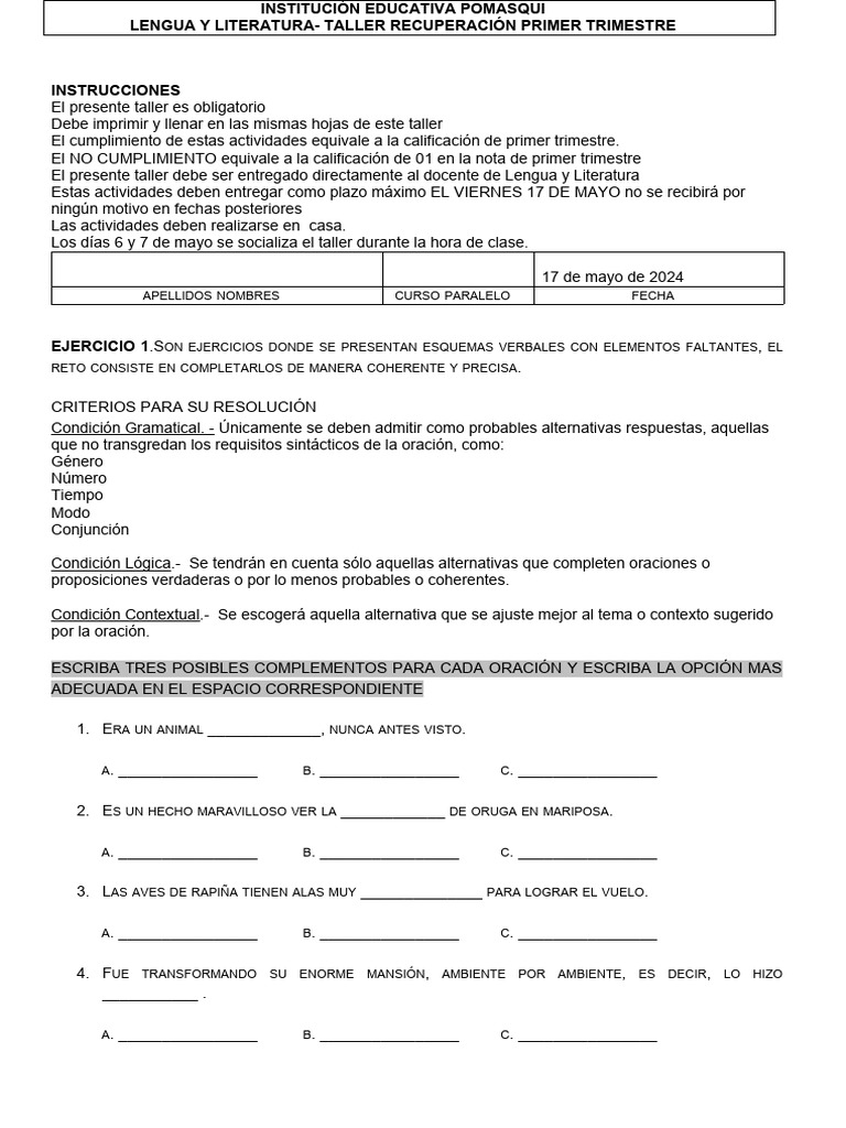 El presente taller debe ser entregado directamente al docente de Lengua y Literatura