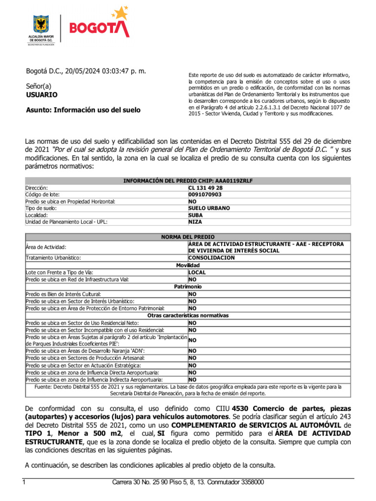 Asunto: Información uso del suelo en el Parágrafo 4 del artículo 2.2.6.1.3.1 del Decreto Nacional 1077 de