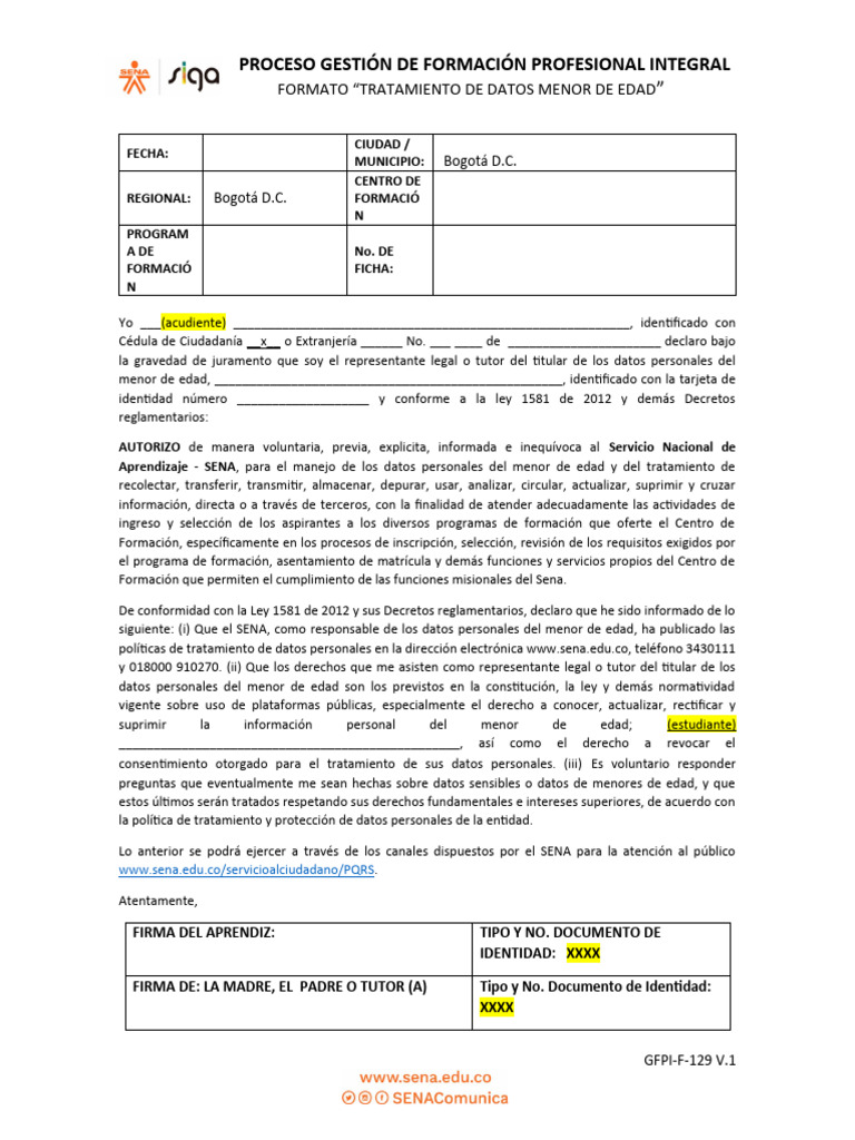 Aprendizaje - SENA, para el manejo de los datos personales del menor de edad y del tratamiento de