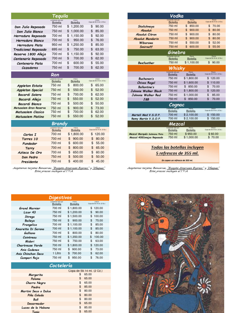 Don Julio Blanco 750 ml $ 1,000.00 $ 85.00 Absolut 750 ml $ 900.00 $ 80.00