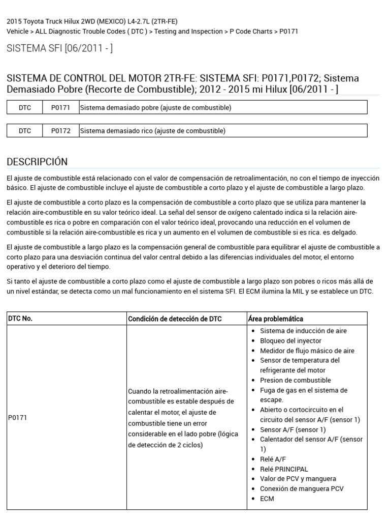 SISTEMA DE CONTROL DEL MOTOR 2TR-FE: SISTEMA SFI: P0171,P0172; Sistema