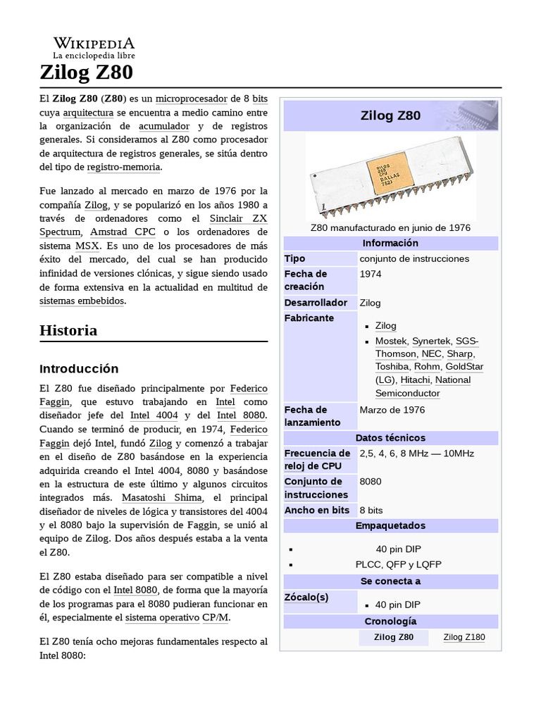 en el microprocesador Z80 en octubre de 1976.3 4 A comienzos de los años 1980 el Z80 o versiones