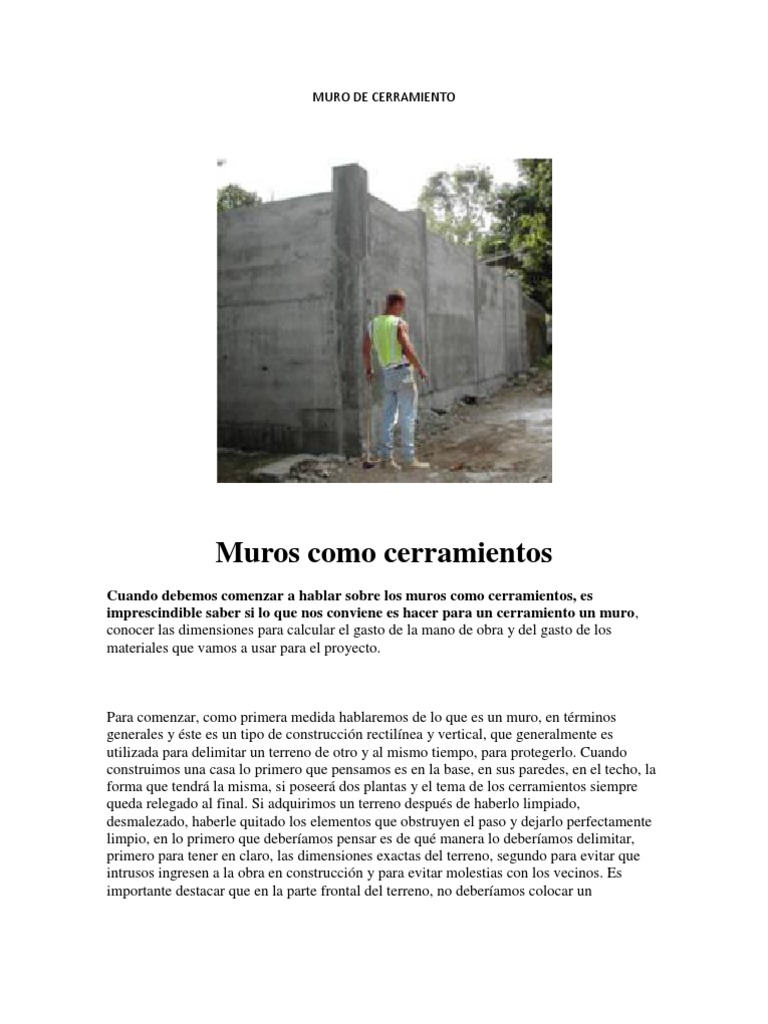 Para comenzar, como primera medida hablaremos de lo que es un muro, en trminos generales y ste es un tipo de construccin rectilnea y vertical, que generalmente es utilizada para delimitar un terreno de otro y al mismo tiempo, para protegerlo. Cuando construimos una casa lo primero que pensamos es en la base, en sus paredes, en el techo, la forma que tendr la misma, si poseer dos plantas y el tema de los cerramientos siempre queda relegado al final. Si adquirimos un terreno despus de haberlo limpiado, desmalezado, haberle quitado los elementos que obstruyen el paso y dejarlo perfectamente limpio, en lo primero que deberamos pensar es de qu manera lo deberamos delimitar, primero para tener en claro, las dimensiones exactas del terreno, segundo para evitar que intrusos ingresen a la obra en construccin y para evitar molestias con los vecinos. Es importante destacar que en la parte frontal del terreno, no deberamos colocar un