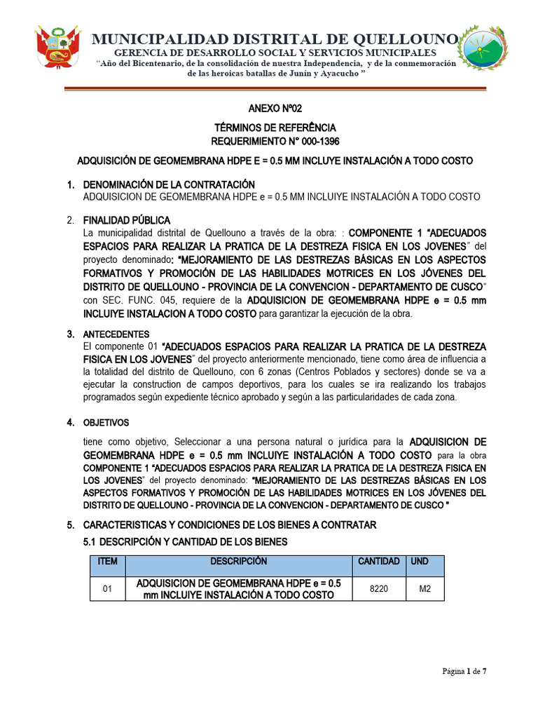 con SEC. FUNC. 045, requiere de la ADQUISICION DE GEOMEMBRANA HDPE e = 0.5 mm