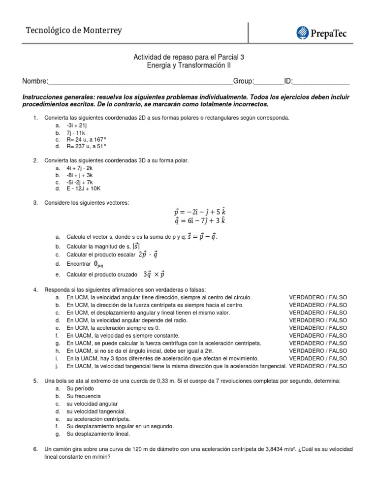 1. Convierta las siguientes coordenadas 2D a sus formas polares o rectangulares según corresponda.