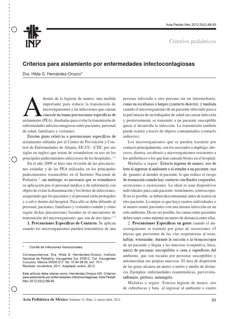 para aislamiento por enfermedades infectocontagiosas. Acta Pediatr influenza, pertusis, meningitis.