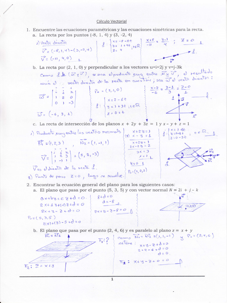 1. Encuentre las ecuaciones paramétricas y tras ecuaciones simétricas para la recta.