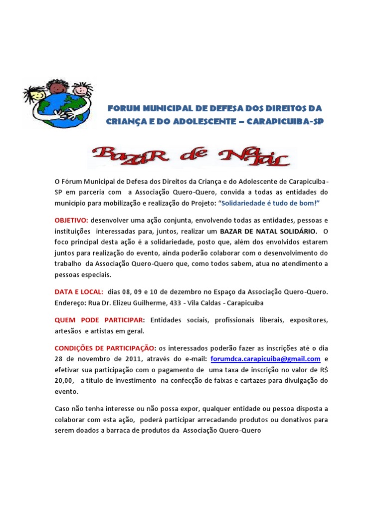 O Frum Municipal de Defesa dos Direitos da Criana e do Adolescente de CarapicuibaSP em parceria com a Associao Quero-Quero, convida a todas as entidades do municpio para mobilizao e realizao do Projeto: Solidariedade tudo de bom! OBJETIVO: desenvolver uma ao conjunta, envolvendo todas as entidades, pessoas e instituies interessadas para, juntos, realizar um BAZAR DE NATAL SOLIDRIO. O foco principal desta ao a solidariedade, posto que, alm dos envolvidos estarem juntos para realizao do evento, ainda podero colaborar com o desenvolvimento do trabalho da Associao Quero-Quero que, como todos sabem, atua no atendimento a pessoas especiais. DATA E LOCAL: dias 08, 09 e 10 de dezembro no Espao da Associao Quero-Quero. Endereo: Rua Dr. Elizeu Guilherme, 433 - Vila Caldas - Carapicuba QUEM PODE PARTICIPAR: Entidades sociais, profissionais liberais, expositores, artesos e artistas em geral. CONDIES DE PARTICIPAO: os interessados podero fazer as inscries at o dia 28 de novembro de 2011, atravs do e-mail: forumdca.carapicuiba@gmail.com e efetivar sua participao com o pagamento de uma taxa de inscrio no valor de R$ 20,00, a ttulo de investimento na confeco de faixas e cartazes para divulgao do evento. Caso no tenha interesse ou no possa expor, qualquer entidade ou pessoa disposta a colaborar com esta ao, poder participar arrecadando produtos ou donativos para serem doados a barraca de produtos da Associao Quero-Quero