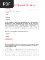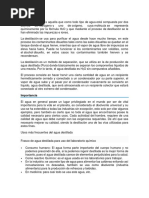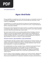 El agua destilada es aquella cuya composicin se basa en la unidad de molculas de H2O. Es aquella a la que se le han eliminado las impurezas e iones mediante destilacin. La destilacin es un mtodo en desuso para la produccin de agua pura a nivel industrial. Esta consiste en separar los componentes lquidos de una mezcla