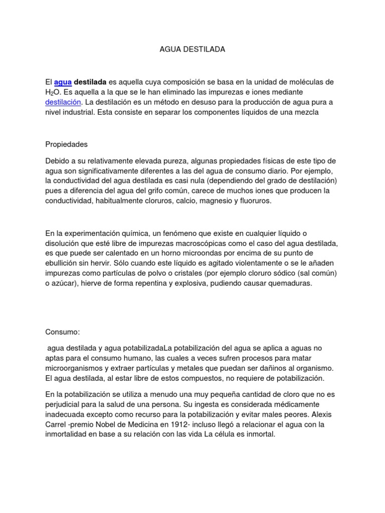 Consumo: agua destilada y agua potabilizadaLa potabilizacin del agua se aplica a aguas no aptas para el consumo humano, las cuales a veces sufren procesos para matar microorganismos y extraer partculas y metales que puedan ser dainos al organismo. El agua destilada, al estar libre de estos compuestos, no requiere de potabilizacin. En la potabilizacin se utiliza a menudo una muy pequea cantidad de cloro que no es perjudicial para la salud de una persona. Su ingesta es considerada mdicamente inadecuada excepto como recurso para la potabilizacin y evitar males peores. Alexis Carrel -premio Nobel de Medicina en 1912- incluso lleg a relacionar el agua con la inmortalidad en base a su relacin con las vida La clula es inmortal.