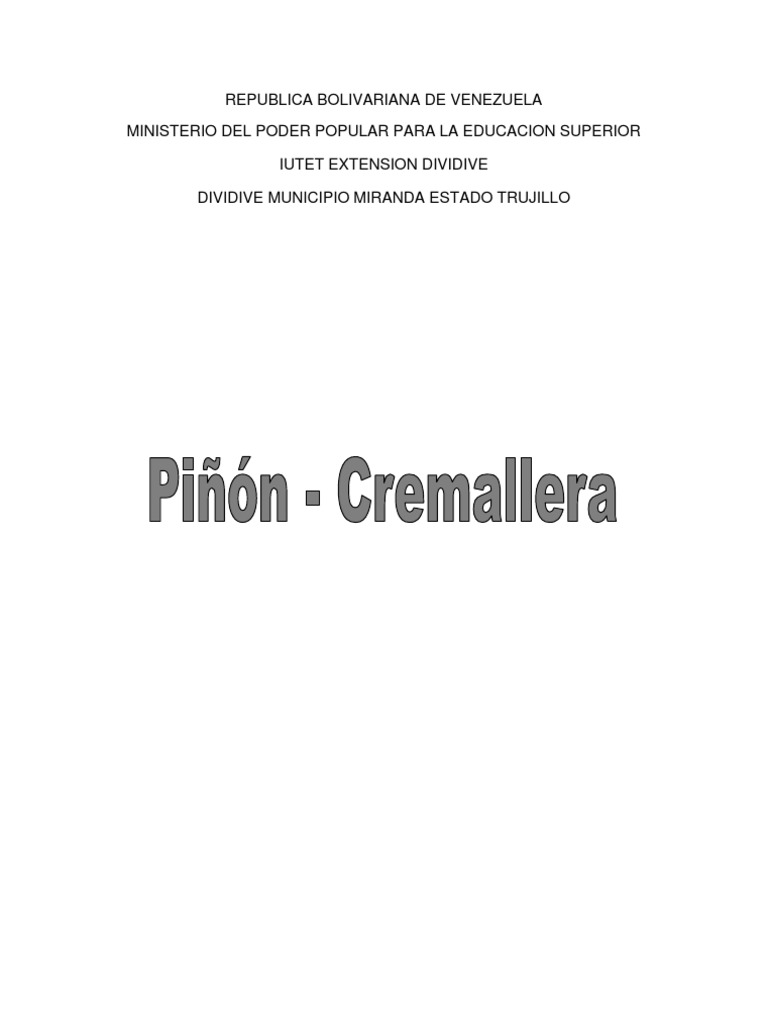 INTRODUCCION: El mecanismo pin-cremallera permite transformar un movimiento circular en un movimiento lineal utilizando una rueda llamada pin y una pieza rectilnea llamada cremallera. El pin es una rueda dentada que gira. La cremallera es una pieza alargada con dientes entre los cuales se encajan los dientes del pin. Se desplaza linealmente a medida que la rueda gira. Cuanto ms rpidamente gira la rueda, ms rpidamente se desplaza la cremallera. En este caso, cuanto mayor sea el ngulo girado por la rueda, mayor ser el recorrido efectuado por la cremallera (d). Si la rueda da una vuelta completa, entonces la cremallera efectuar un recorrido igual a la circunferencia de la rueda: d = 2R. Puesto que la rueda en principio puede girar indefinidamente, debe haber algn sistema que evite que la cremallera se salga; es decir, tras cierto recorrido, la cremallera llegar a un tope que evitar que la rueda siga girando. La velocidad de la cremallera depender del radio del pin y de su velocidad de giro. Cuanto mayor sea el pin y ms deprisa gire, ms rpido se desplazar la cremallera. En este trabajo se establecern los clculos necesarios para la fabricacin de estos elementos mecnicos, clculos para interpretar parte del funcionamiento, adems de sus aplicaciones ventajas y desventajas, entre otras cosas, se espera que la investigacin tenga informacin que sea del agrado del lector y sirva para la base de otros trabajos similares.