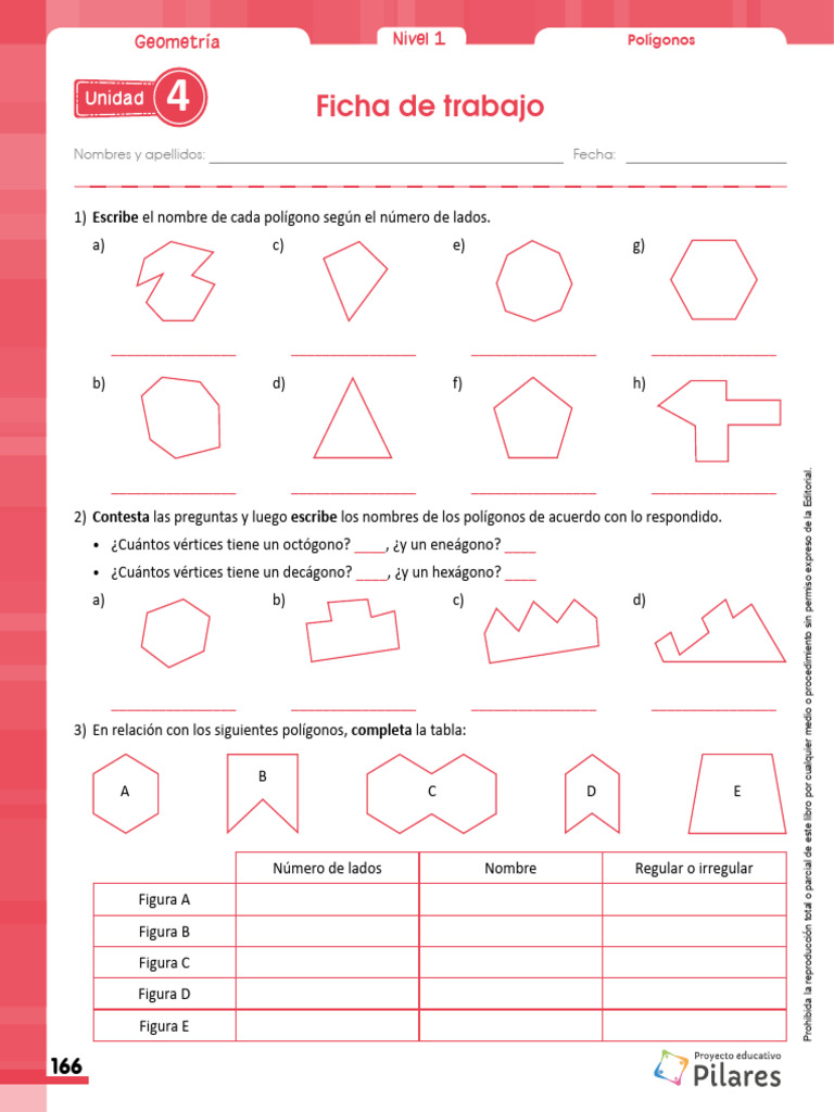2) Observa los polígonos y escribe el número de lados, vértices y ángulos según corresponda.