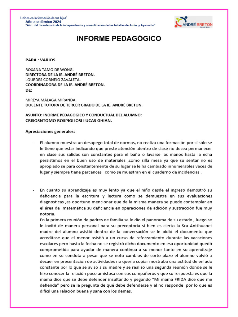 ASUNTO: INORME PEDAGÓGICO Y CONDUCTUAL DEL ALUMNO:
