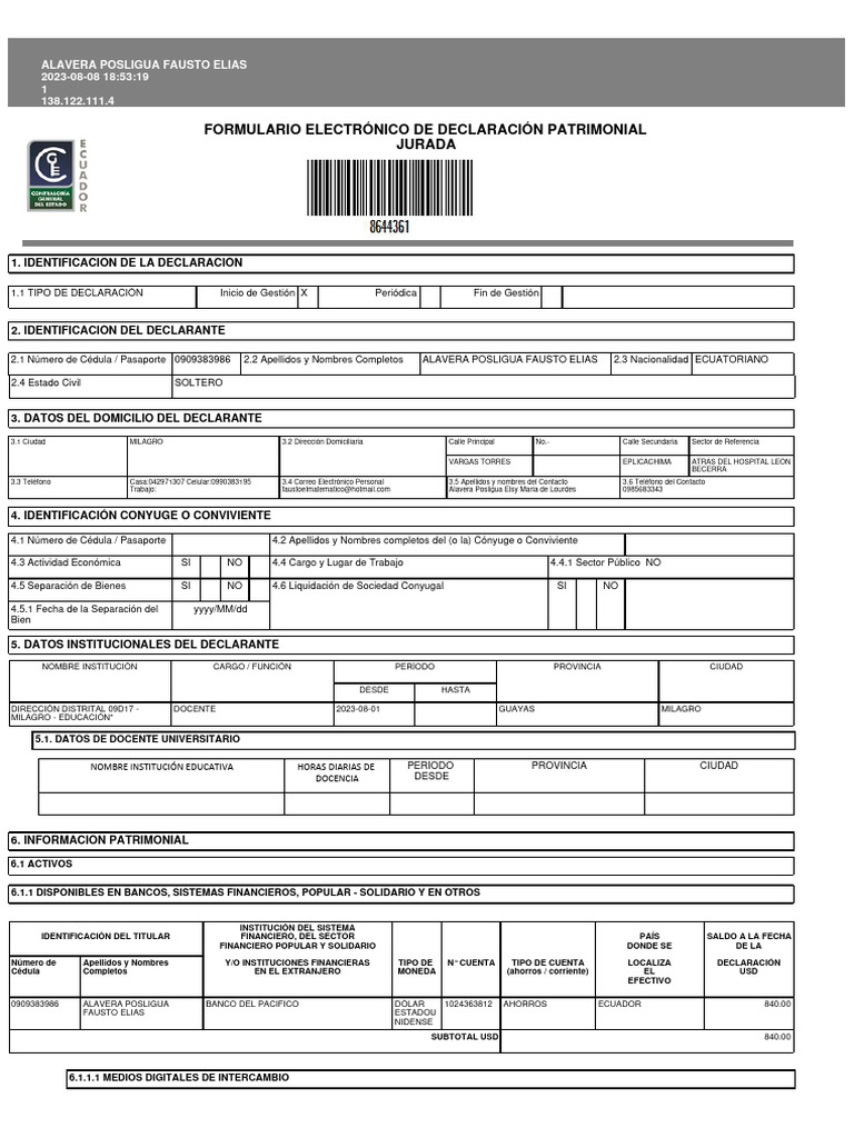 Esta Declaración Patrimonial Jurada constituye documento público, y la información consignada es verdadera y podrá ser verificada por la Contraloría General del Estado.