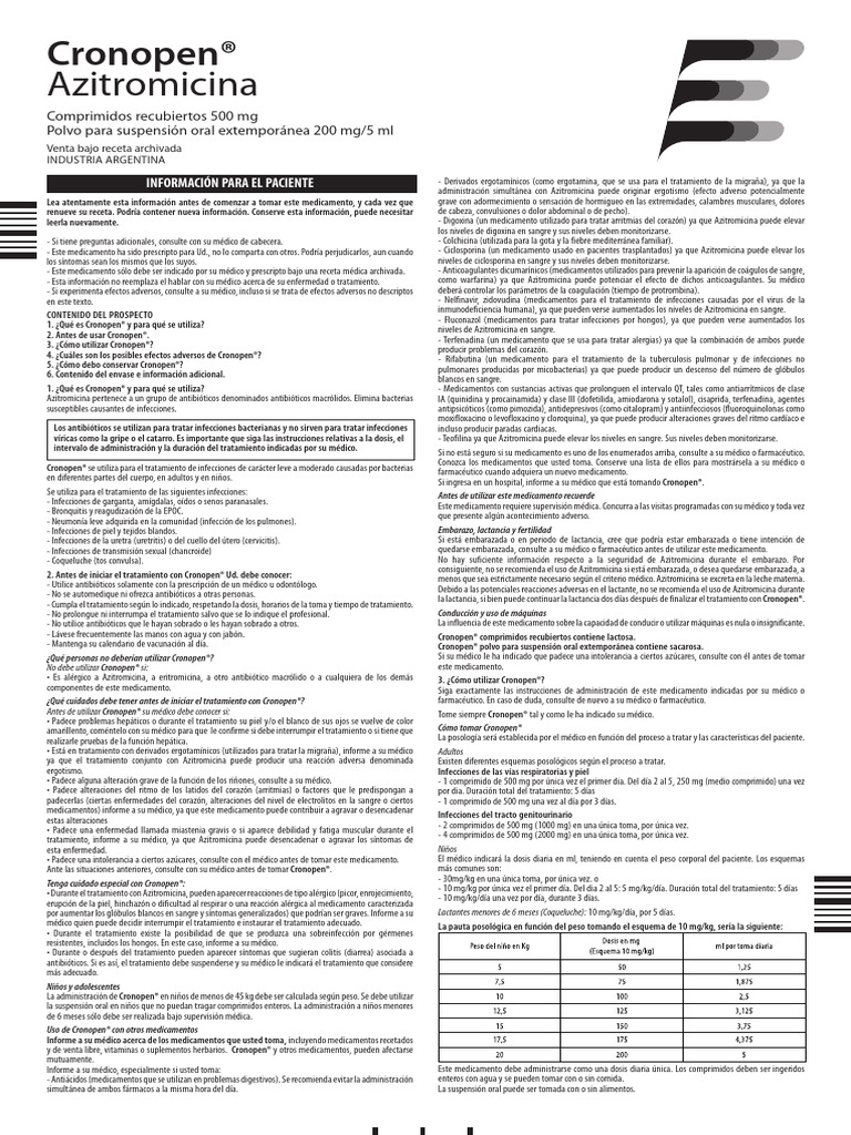 administrarlo 1 hora antes ó 2 horas después de las comidas. Azitromicina se debe usar con precaución en pacientes que reciban medicamentos que se Efectos sobre la capacidad para conducir y utilizar máquinas Cronopen® 500 mg: conservar a temperatura ambiente, hasta 30°C.