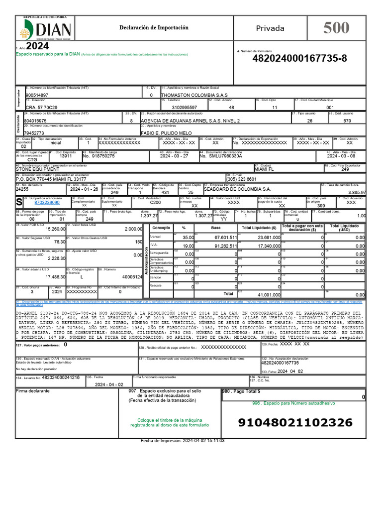 84 . Valor aduana USD 85 . Código registro 86 . Número