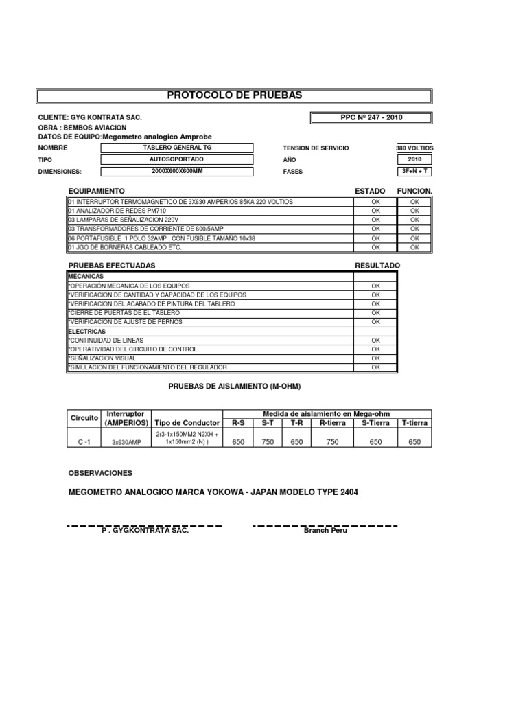 CLIENTE: GYG KONTRATA SAC. OBRA : BEMBOS AVIACION DATOS DE EQUIPO: Megometro analogico Amprobe NOMBRE