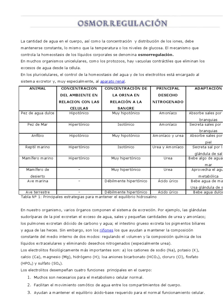 niveles de glucosa. El mecanismo que controla la homeostasis de los lquidos corporales se denomina osmorregulacin. En muchos organismos unicelulares, como los protozoos, hay vacuolas contrctiles que eliminan los excesos de agua desde la clula. En los pluricelulares, el control de la homeostasis del agua y de los electrolitos est encargado al sistema excretor y, muy especialmente, al aparato renal. ANIMAL CONCENTRACION DEL AMBIENTE EN RELACION CON LAS Pez de agua dulce Pez de Mar Anfibio Reptil marino Mamfero marino Mamfero de desierto Ave marina CELULAS Hipotnico Hipertnico Hipotnico Hipertnico Hipertnico CONCENTRACIN DE LA ORINA EN RELACIN A LA SANGRE Muy hipotnico Isotnico Muy hipotnico Isotnico Muy hipertnico Muy hipertnico Dbilmente hipertnico PRINCIPAL DESECHO NITROGENADO Amonaco Amonaco Amonaco y urea Urea y Amonaco Urea Urea cido rico Absorbe sales por ADAPTACIN