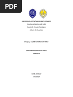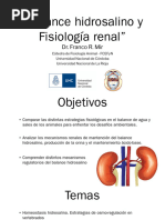 BALANCE DE SODIO En condiciones de normalidad en el organismo, el metabolismo del sodio se mantiene constante, es decir, existe un equilibrio entre la entrada y la salida, siempre y cuando no exista prdidas cutneas: excesiva sudoracin, o gastrointestinal: diarreas. La principal va de eliminacin del sodio es el rin, que interviene directamente en la regulacin de su equilibrio, como quiera que este catin es el ms importante del espacio extracelular, el funcionamiento renal se halla directamente relacionado con el volumen del lquido extracelular. Diferentes mecanismos fisiolgicos contribuyen a mantener constante el balance del sodio. El principal estmulo sobre el rin lo constituyen las modificaciones del volumen arterial efectivo. La deshidratacin o la hemorragia determinan una disminucin del volumen arterial efectivo, que provoca una mayor reabsorcin tubular de sodio, mientras que una perfusin salina condiciona un aumento del volumen arterial efectivo, determinando una disminucin de la reabsorcin tubular de sodio. Se han mencionado diferentes mecanismos que regulan las variaciones de volumen arterial efectivo que influyen en la eliminacin urinaria de sodio, ellos son: El flujo sanguneo entrarrenal (mayor o menor grado de vasoconstriccin), regula la reabsorcin tubular de sodio y agua, mediante las modificaciones que se presentan en las fuerzas fsicas que controlan la filtracin glomerular y el transporte tubular de agua y solutos en el tbulo proximal. Si existe disminucin del flujo plasmtico renal (FPR), se presenta vasoconstriccin en la arteria eferente que mantiene la presin hidrosttica en el glomrulo, por lo tanto la filtracin glomerular (FG) disminuye en menor proporcin que el FPR. Este incremento de la fraccin de filtracin (FF) ocasiona una mayor concentracin de las protenas en el plasma, que del glomrulo pasa a los capilares peritubulares El incremento de la presin coloidosmtica en estos capilares determina una mayor reabsorcin en el tbulo proximal. Este fenmeno ha sido denominado "Balance glomrulo-tubular", constituye el Factor I o Primer Factor. La aldosterona, constituye el segundo mecanismo o Segundo Factor. Cuando existe una disminucin de la presin de perfusin renal, de un aumento excesivo de sodio que detecta la mcula densa, o la hiperactividad del sistema simptico, determinan un aumento de la secrecin de renina y secundariamente de aldosterona. Esta estimula la reabsorcin de sodio en el tbulo distal. La hormona natriurtica, que corresponde al Tercer Factor, determina una mayor eliminacin de sodio por la orina, cuando existe una expansin de agua del volumen extracelular. Se ha sugerido su origen en el hipotlamo, su actividad se halla relacionada con la volemia arterial efectiva. Tambin se ha descrito el factor natriurtico atrial (FNA), que aumenta la eliminacin de sodio, en respuesta a los estmulos que distienden la aurcula derecha. BALANCE DEL AGUA El rin tiene la propiedad de regular al balance hdrico del organismo y sobre todo de separar la eliminacin del agua de los solutos. La reabsorcin del agua se realiza a lo largo del tbulo renal, pero la mayor parte se efecta en el tbulo proximal (reabsorcin obligada). La disociacin de agua y solutos se efecta en el tbulo distal, que se halla condicionada a los niveles plasmticos de la hormona antidiurtica (ADH). La cantidad de ADH se halla regulada por los cambios de osmolaridad