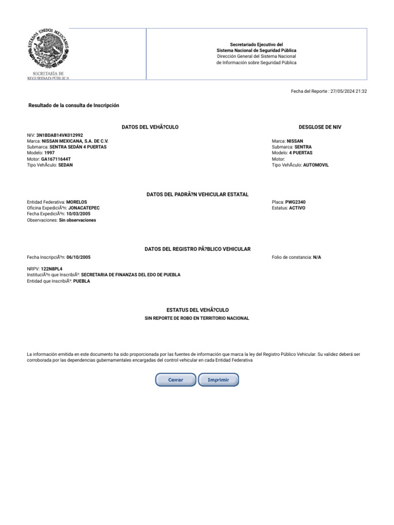 La información emitida en este documento ha sido proporcionada por las fuentes de información que marca la ley del Registro Público Vehicular. Su validez deberá ser
