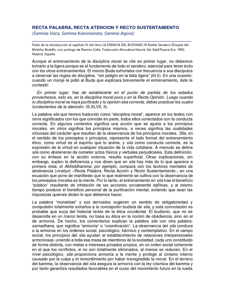 abstinencia (viratiyo) –Recta Palabra, Recta Acción y Recto Sustentamiento-, en una
