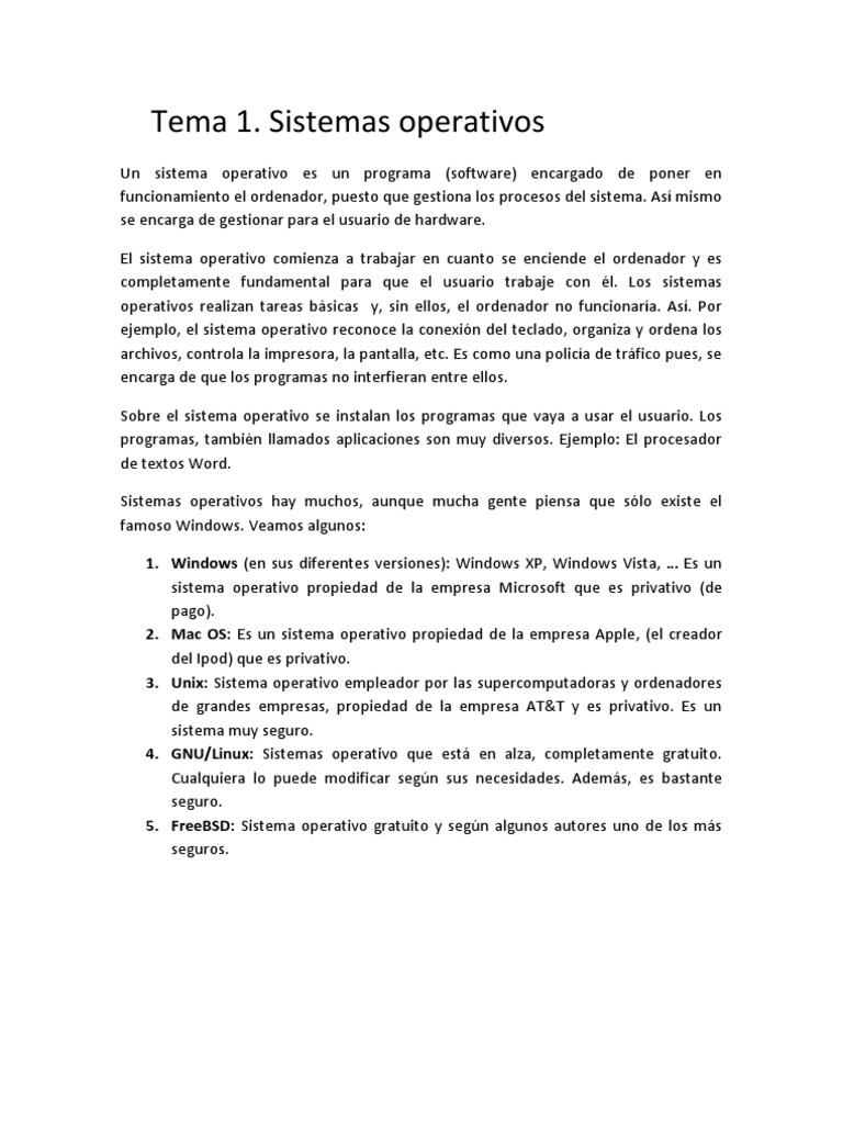 Un sistema operativo es un programa (software) encargado de poner en funcionamiento el ordenador, puesto que gestiona los procesos del sistema. As mismo se encarga de gestionar para el usuario de hardware. El sistema operativo comienza a trabajar en cuanto se enciende el ordenador y es completamente fundamental para que el usuario trabaje con l. Los sistemas operativos realizan tareas bsicas y, sin ellos, el ordenador no funcionara. As. Por ejemplo, el sistema operativo reconoce la conexin del teclado, organiza y ordena los archivos, controla la impresora, la pantalla, etc. Es como una polica de trfico pues, se encarga de que los programas no interfieran entre ellos. Sobre el sistema operativo se instalan los programas que vaya a usar el usuario. Los programas, tambin llamados aplicaciones son muy diversos. Ejemplo: El procesador de textos Word. Sistemas operativos hay muchos, aunque mucha gente piensa que slo existe el famoso Windows. Veamos algunos: 1. Windows (en sus diferentes versiones): Windows XP, Windows Vista, Es un sistema operativo propiedad de la empresa Microsoft que es privativo (de pago). 2. Mac OS: Es un sistema operativo propiedad de la empresa Apple, (el creador del Ipod) que es privativo. 3. Unix: Sistema operativo empleador por las supercomputadoras y ordenadores de grandes empresas, propiedad de la empresa AT&T y es privativo. Es un sistema muy seguro. 4. GNU/Linux: Sistemas operativo que est en alza, completamente gratuito. Cualquiera lo puede modificar segn sus necesidades. Adems, es bastante seguro. 5. FreeBSD: Sistema operativo gratuito y segn algunos autores uno de los ms seguros.
