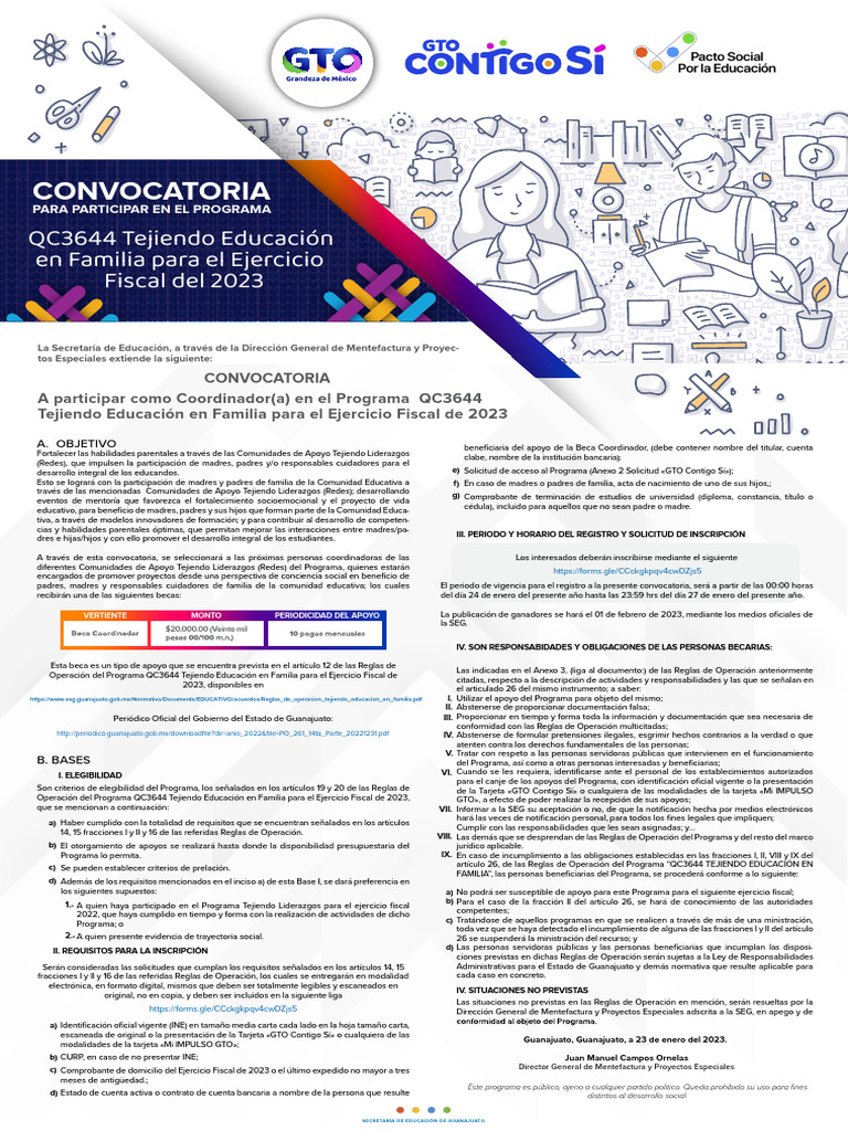 Operación del Programa QC3644 Tejiendo Educación en Familia para el Ejercicio Fiscal de 2023, GTO», a efecto de poder realizar la recepción de sus apoyos;