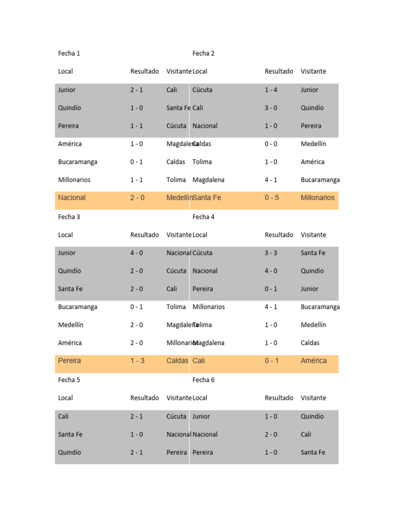 Cali 2-1 Cúcuta Junior 1-0 Quindío