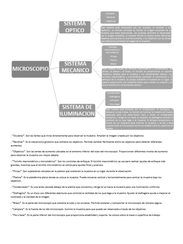 - *Objetivos*: Son las lentes de aumento ubicadas en el extremo inferior del tubo del microscopio. Proporcionan diferentes niveles de aumento