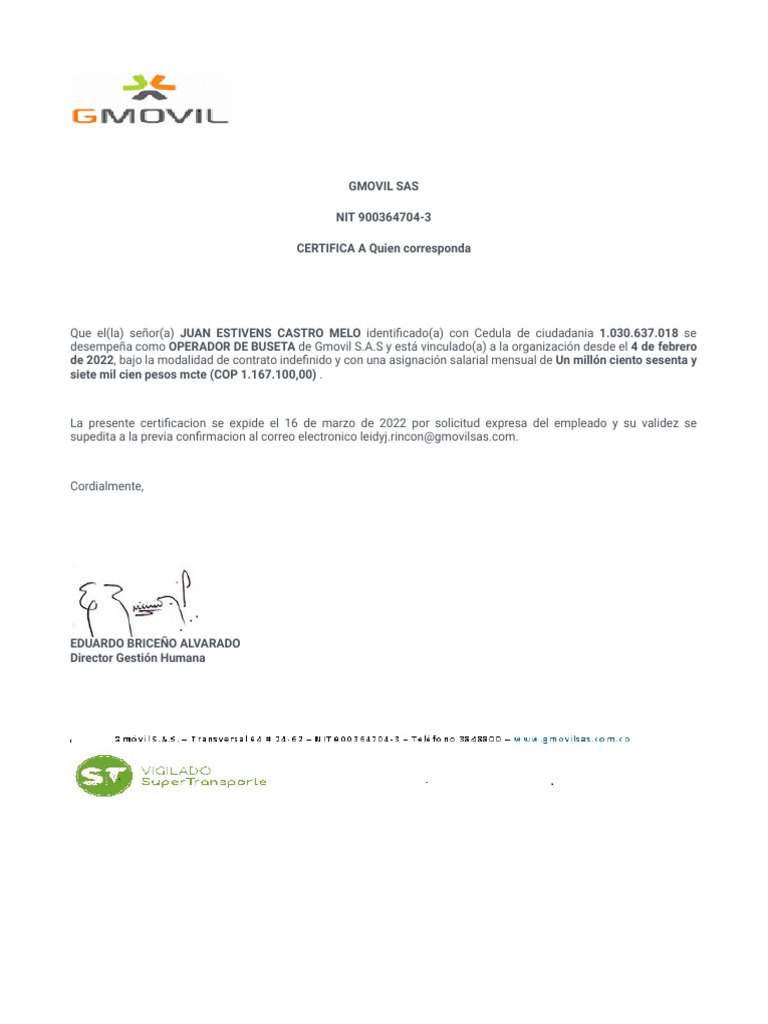 La presente certificacion se expide el 16 de marzo de 2022 por solicitud expresa del empleado y su validez se