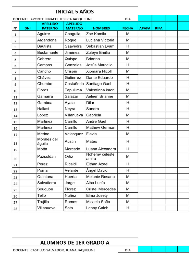 N° DNI APELLIDO APELLIDO NOMBRES FECHA APAFA RIFA