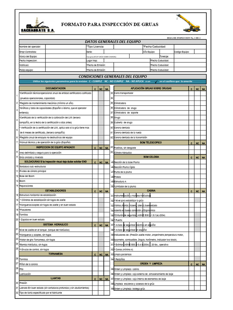 FORMATO PARA INSPECCIÓN DE GRUAS