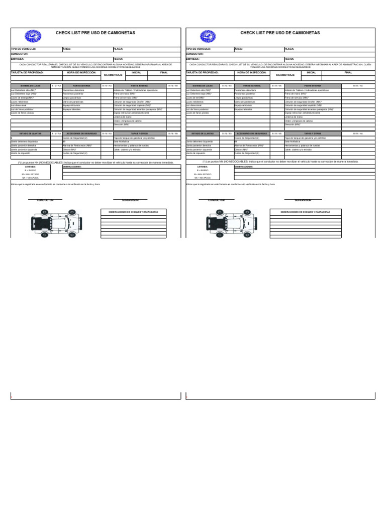 CHECK LIST PRE USO DE CAMIONETAS CHECK LIST PRE USO DE CAMIONETAS