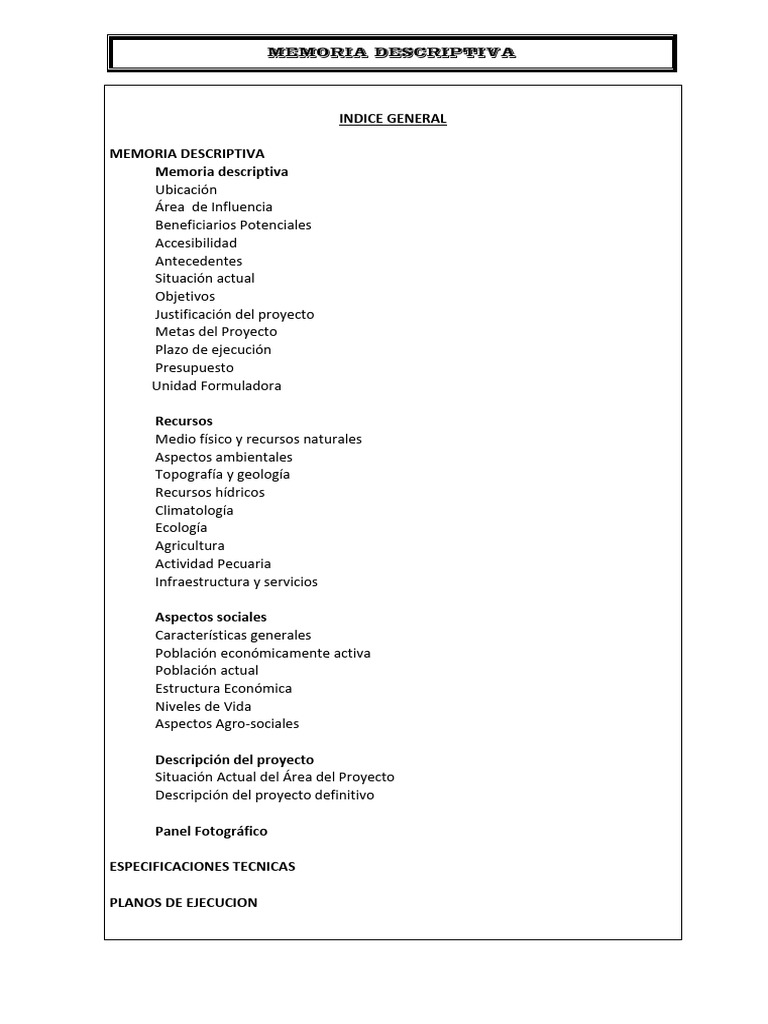 cuenta con un expediente técnico elaborado en Octubre del 2,002 que incluye: Memoria