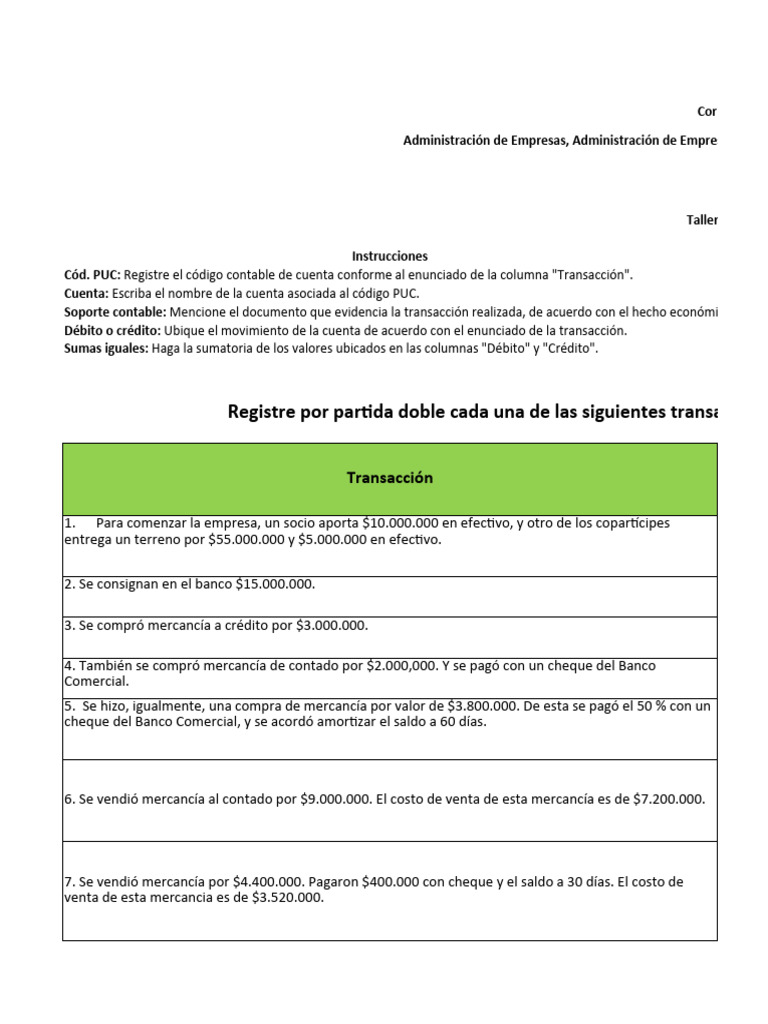 Cód. PUC: Registre el código contable de cuenta conforme al enunciado de la columna "Transacción".